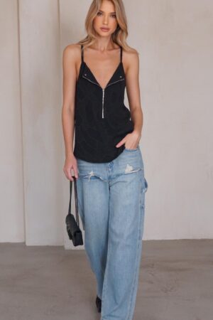 גופיית וי עם כתפיות דקות, משולבת רוכסן מקדימה.