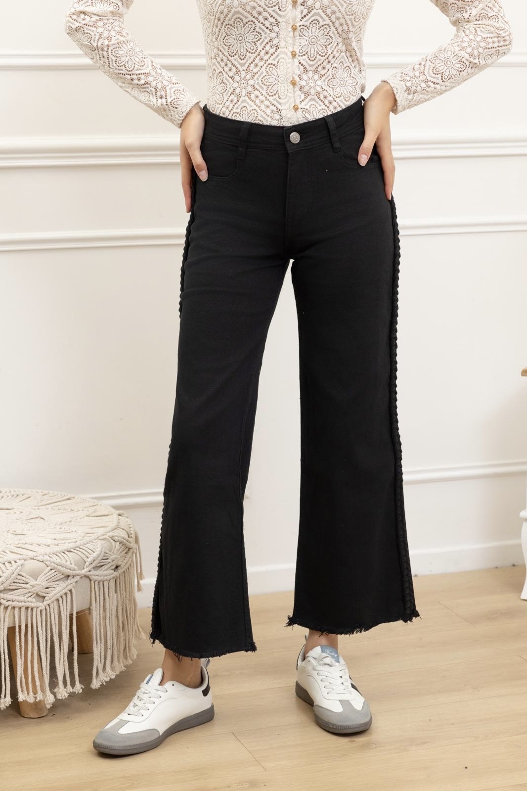 שדרגי את המלתחה שלך עם הג'ינס הכי מבוקש של העונה ב-ROZIT. הג'ינס מעוצב בגזרה ישרה שתמיד נשארת באופנה, ומיוצר מבד דנים איכותי ועמיד עם אחוז קטן של סטרץ' המבטיח התאמה מחטבת ונוחה לאורך כל היום. האלמנט המרכזי שגונב את ההצגה הוא עיטור הצמה המלופף סביב הכיסים והמותן, המעניק לג'ינס מראה עשיר ויוקרתי. הגזרה הגבוהה והדיוק בתפרים הופכים אותו לפרטנר המושלם למגוון שילובים – החל מבלייזר מחויט למראה ערב ועד לסריג רך לימי החורף הקרירים.