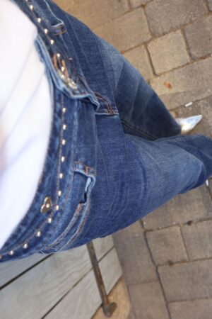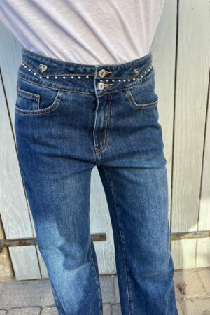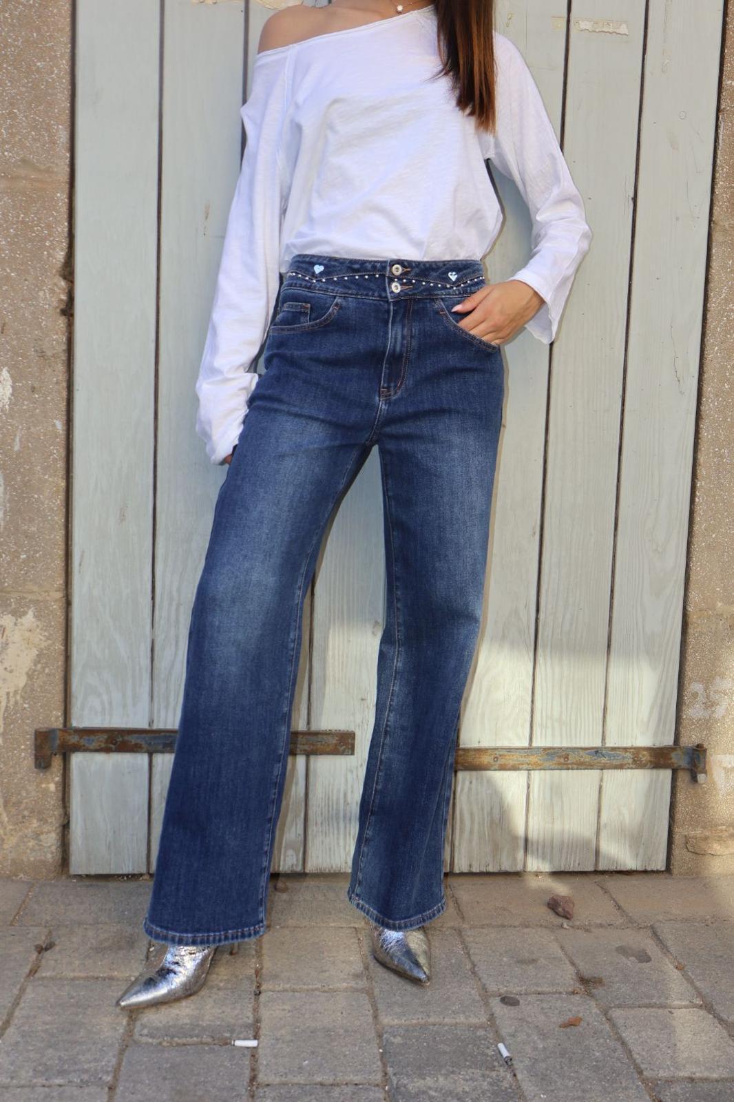 גינס עם חגורה עבה ורוכסנים כפולים, כיסים סיומת מתרחבת חגורה כסופה עם לבבות.