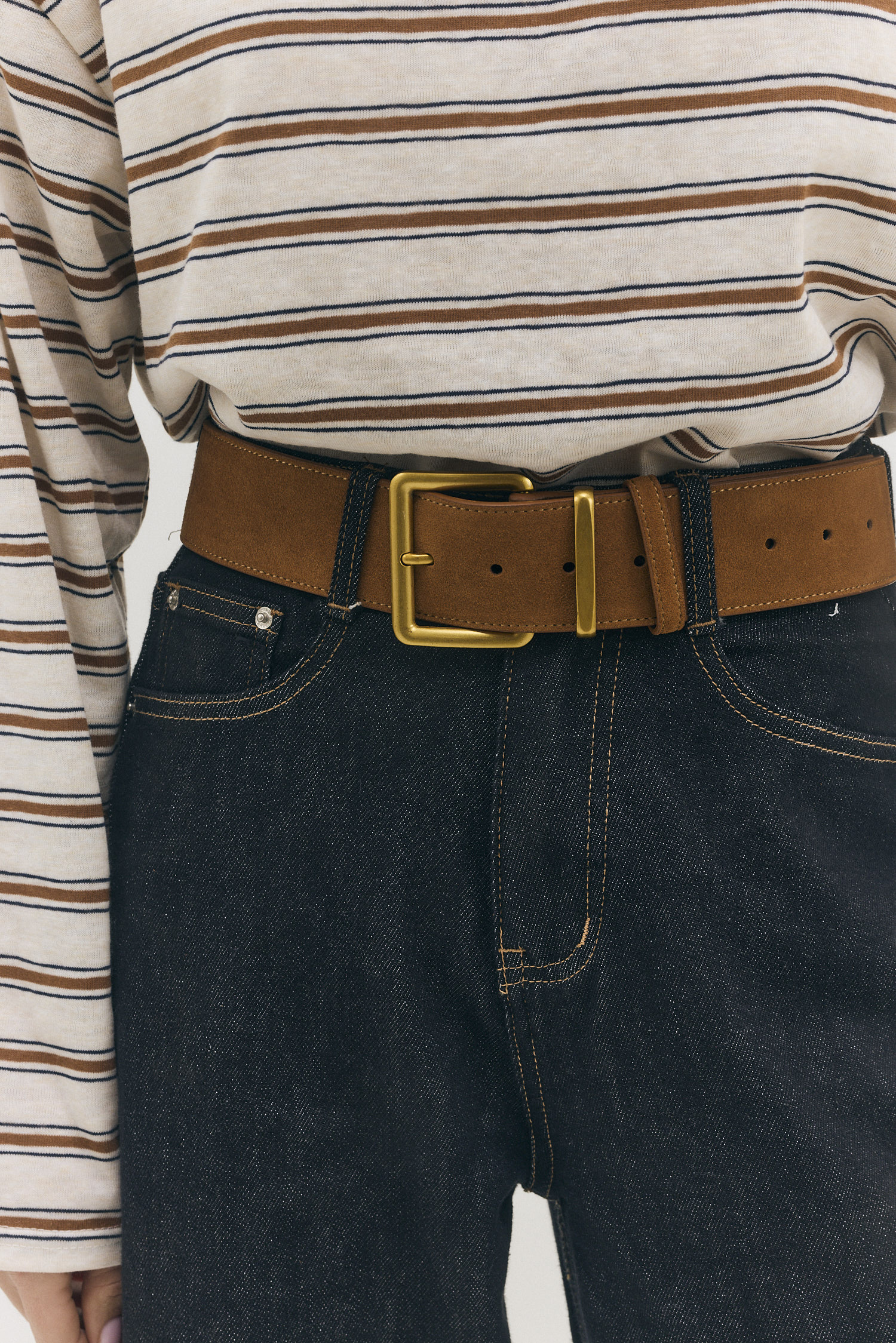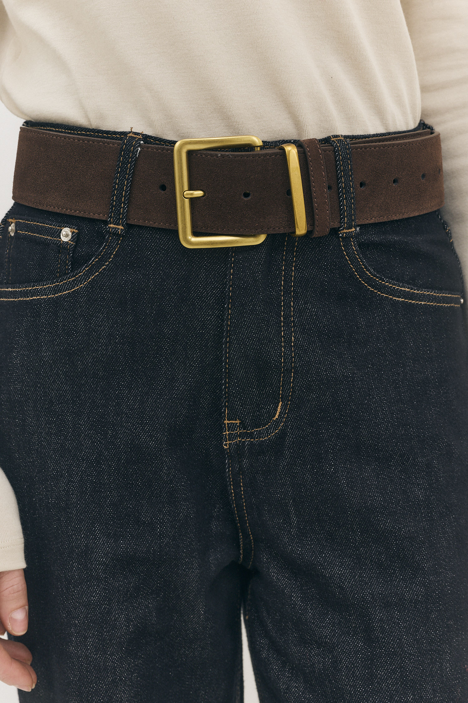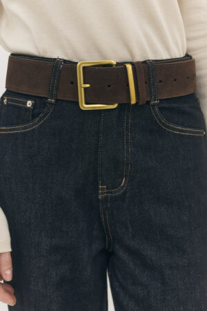 חגורת עור זמש עבה במיוחד בעיצוב קלאסי, בעלת מרקם רך, מעוטרת באבזם מרובע בצבע זהב מבריק המוסיף טאץ' אלגנטי.