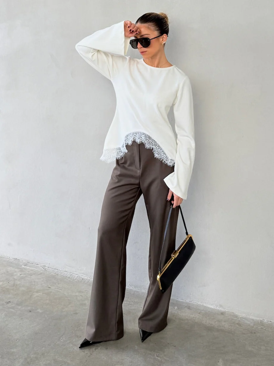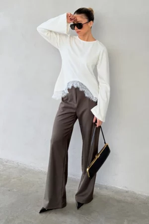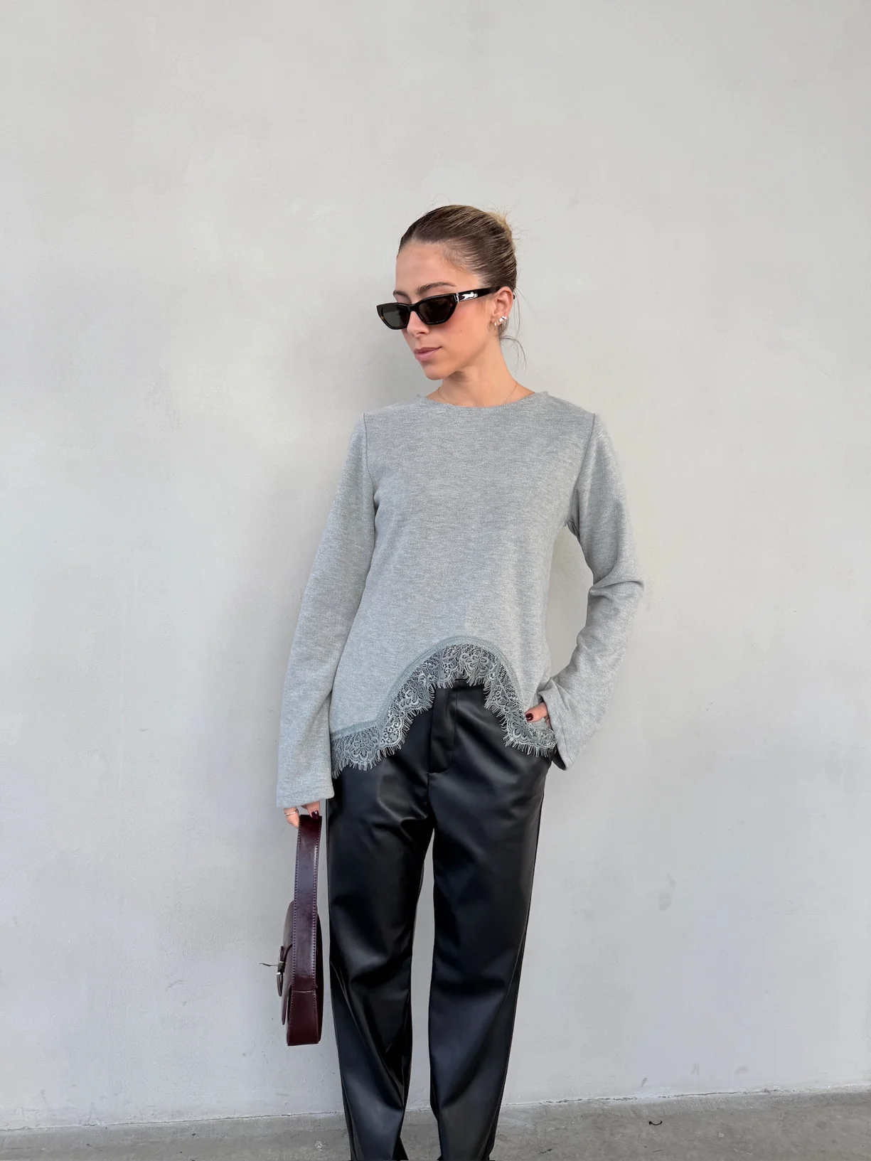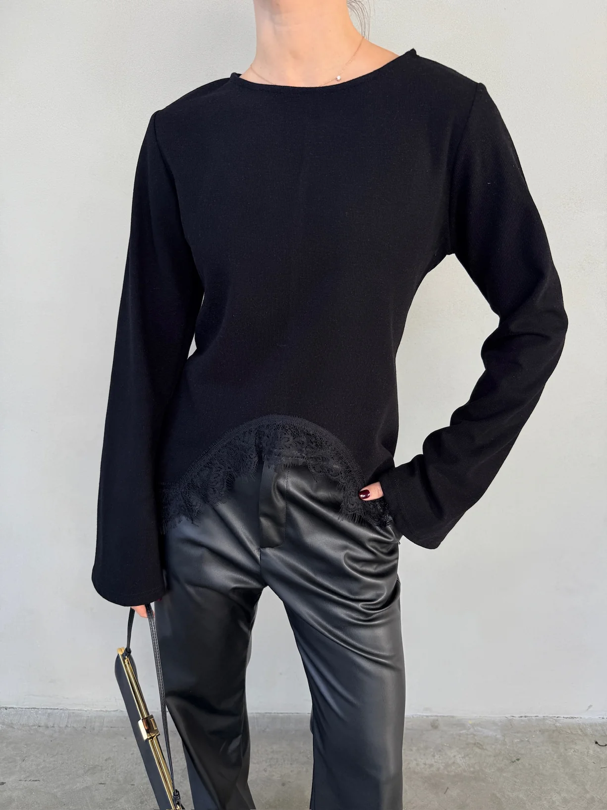 חולצה מבד סריג עם שרוולים ארוכים ומעט מתרחבים בקצוות. בקו התחתון של החולצה מופיע עיטור תחרה עדין שמשתלב בצורת קשת, מתאים ללוק מתוחכם ואלגנטי שמתאים גם ליום-יום וגם לאירועים.