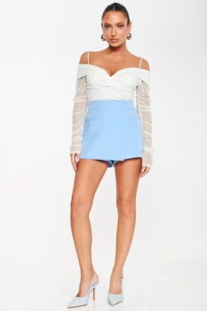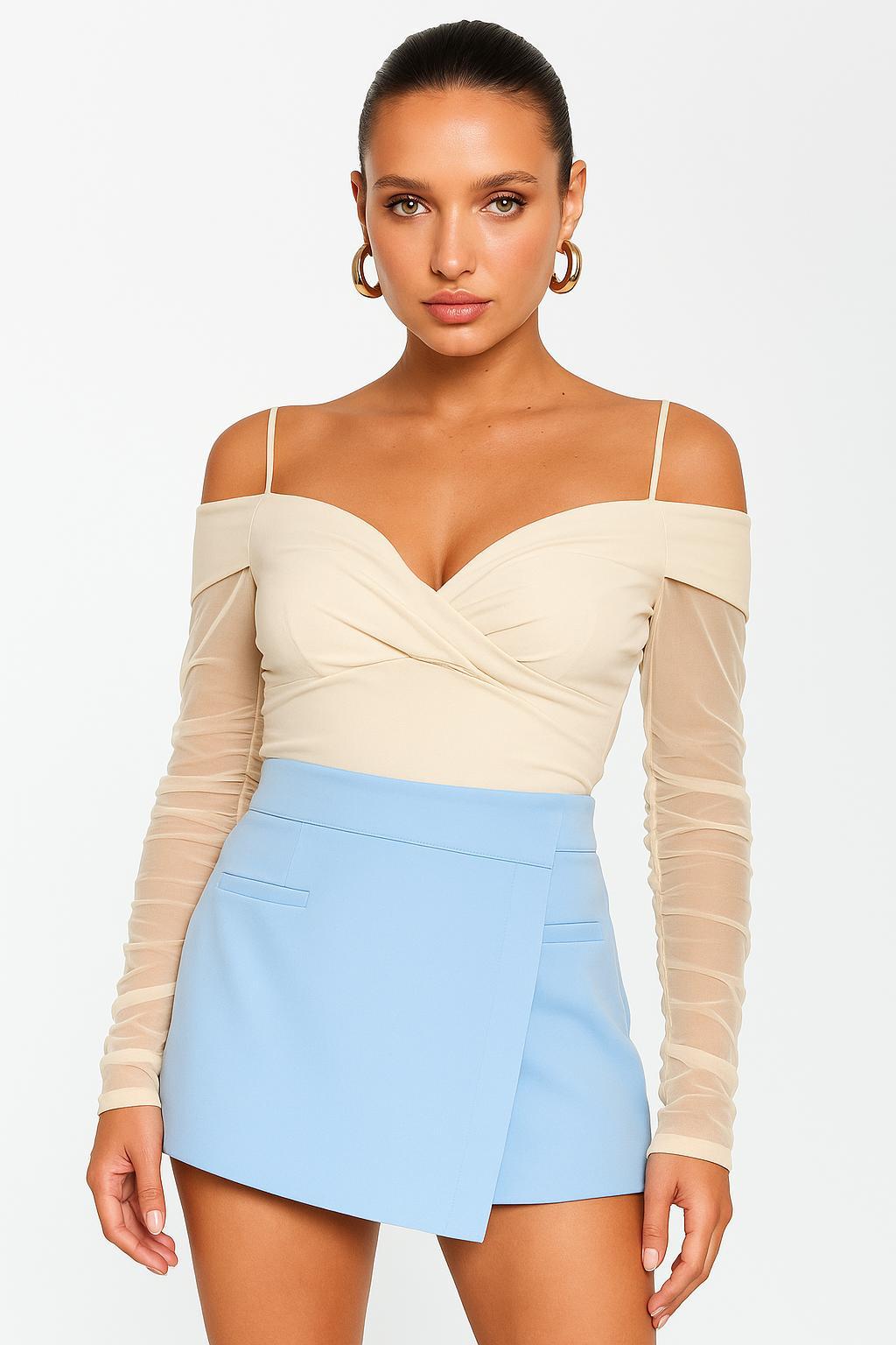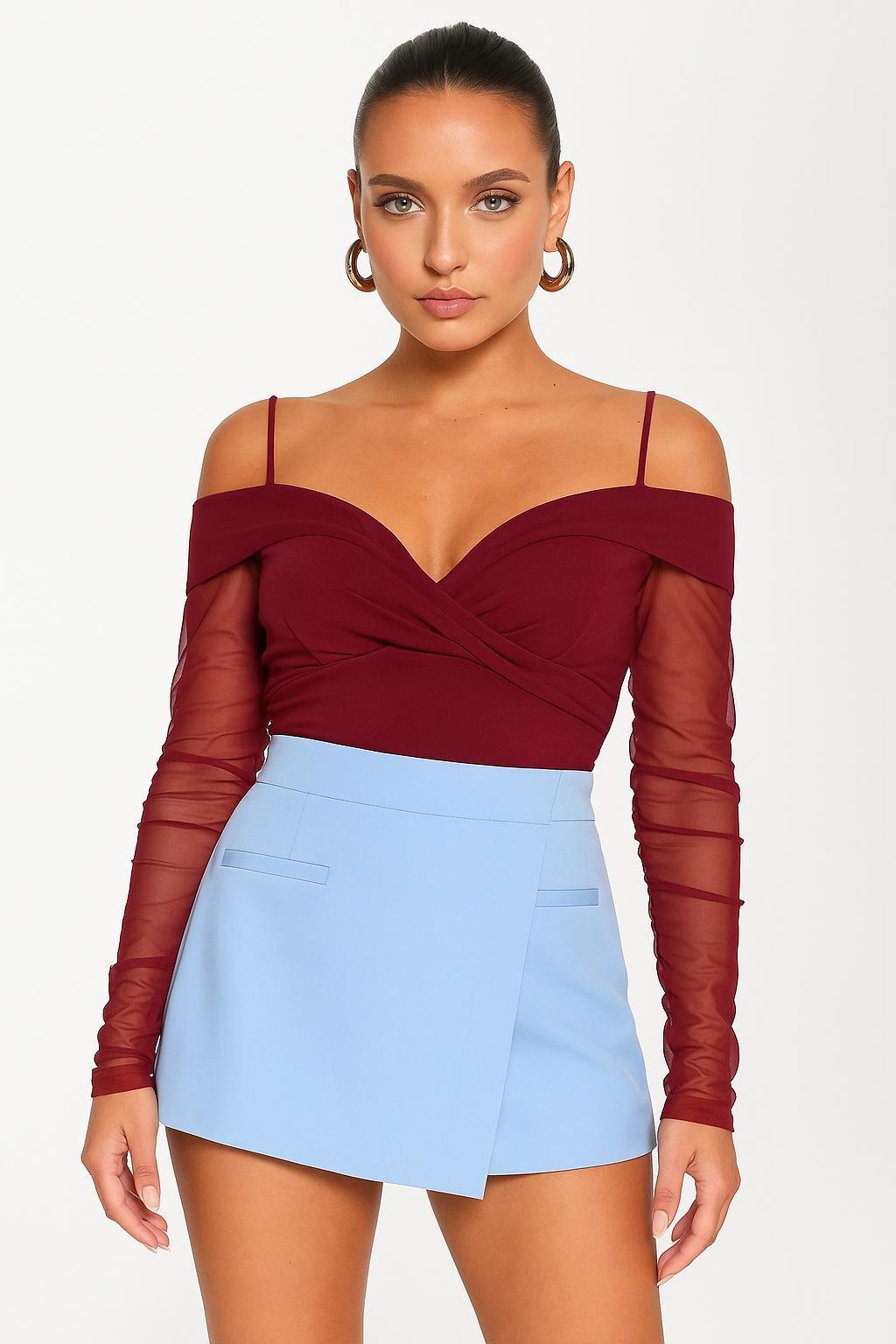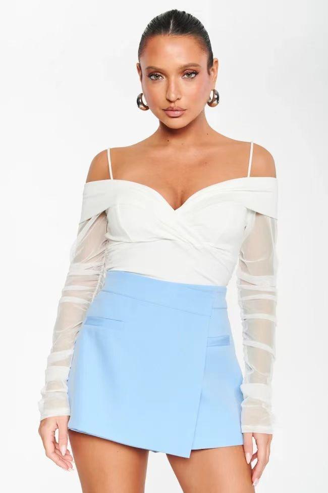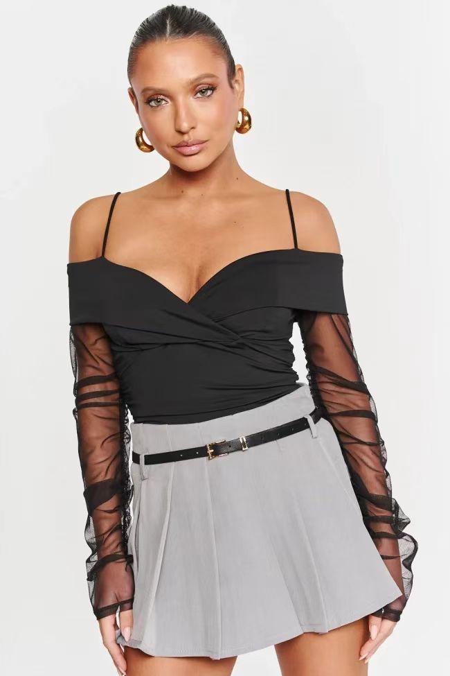 חולצת ערב בגזרת ריטה עם כתפיות דקות מחשוף מיוחד ועמוק שרוולים מבד רשת שקוף. החולצה במידה ONE SIZE