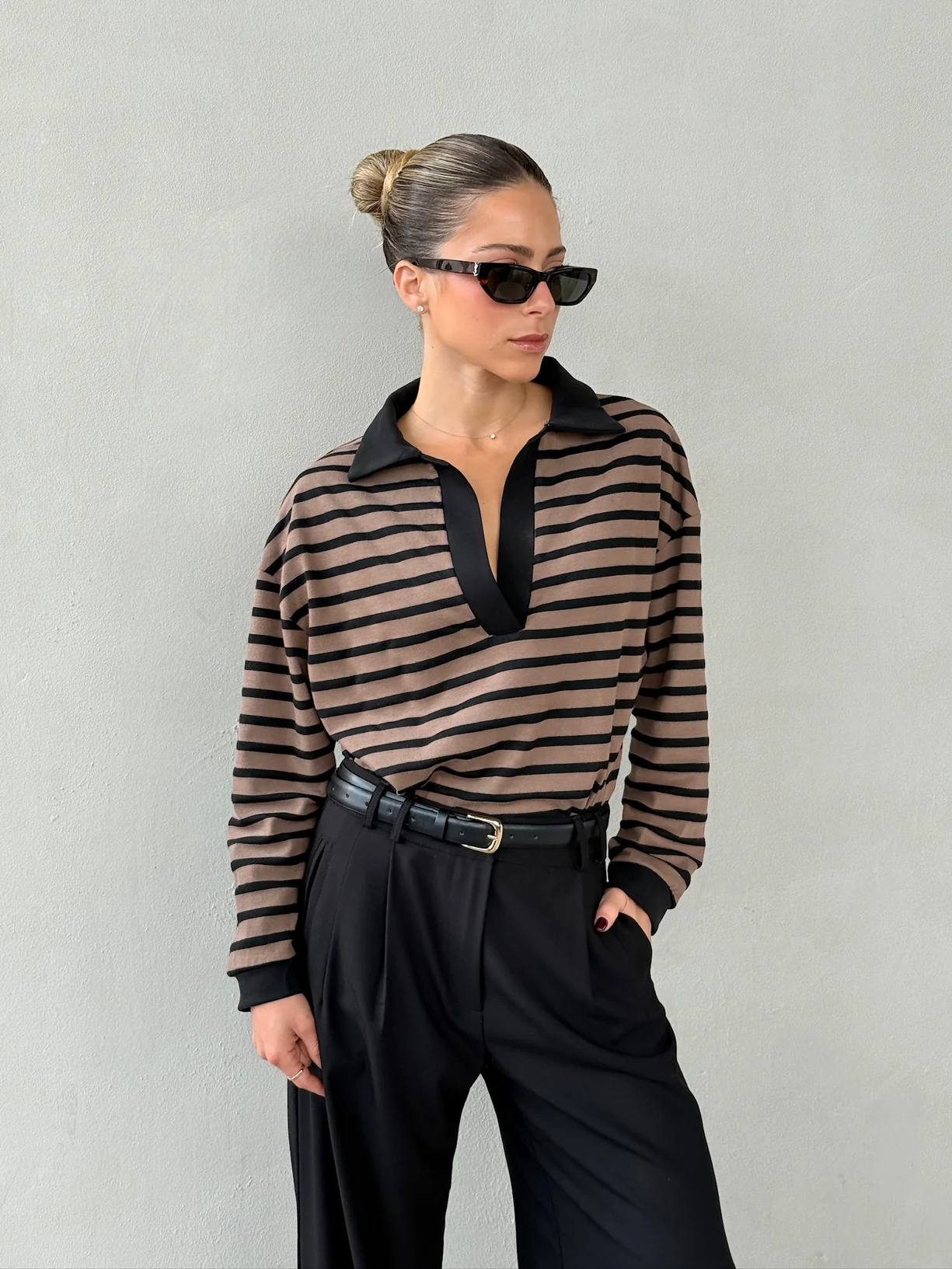 חולצת צווארון עם פסים, בגזרת אוברסייז מבד רוגבי למראה קליל ולא מתאמץ