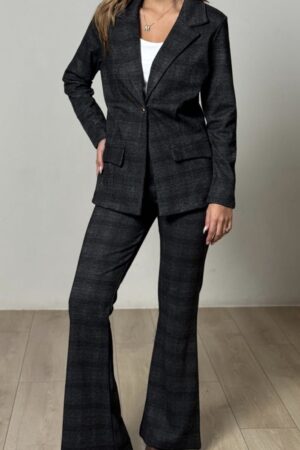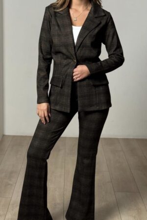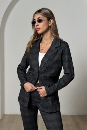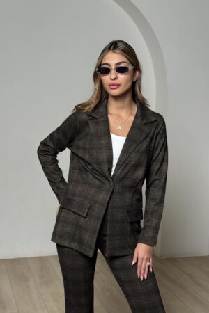 בלייזר ארוך עם רכיסת כפתור, מכנס בגזרה מחטבת עם סיומת פדלפון.