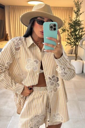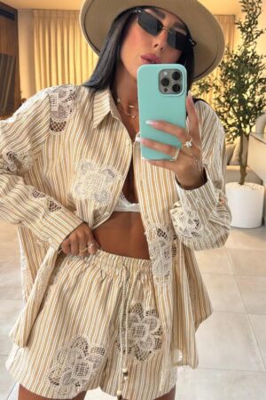 חליפת 2 חלקים בפרינט פסים בשילוב רקמה, חליפה מעלפת שתתאים לך להכל, מסעדב/חג/יציאה.