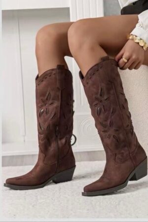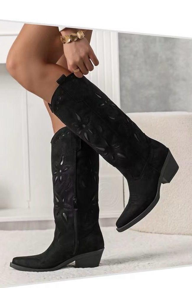 מגפי בוקרים גבוהים לנשים דמוי עור, עיטורי לייזר מחוררים ייבוא מאיטליה J29