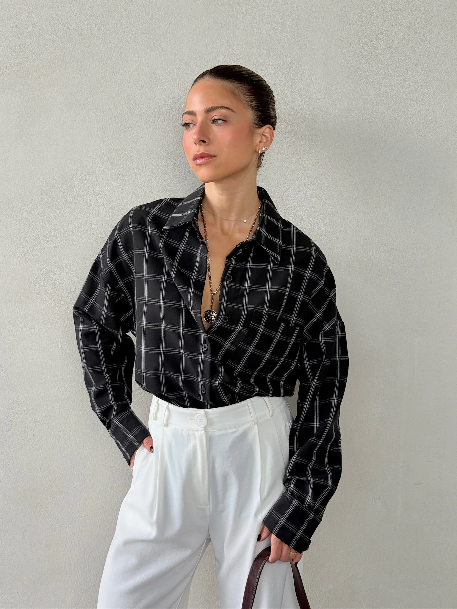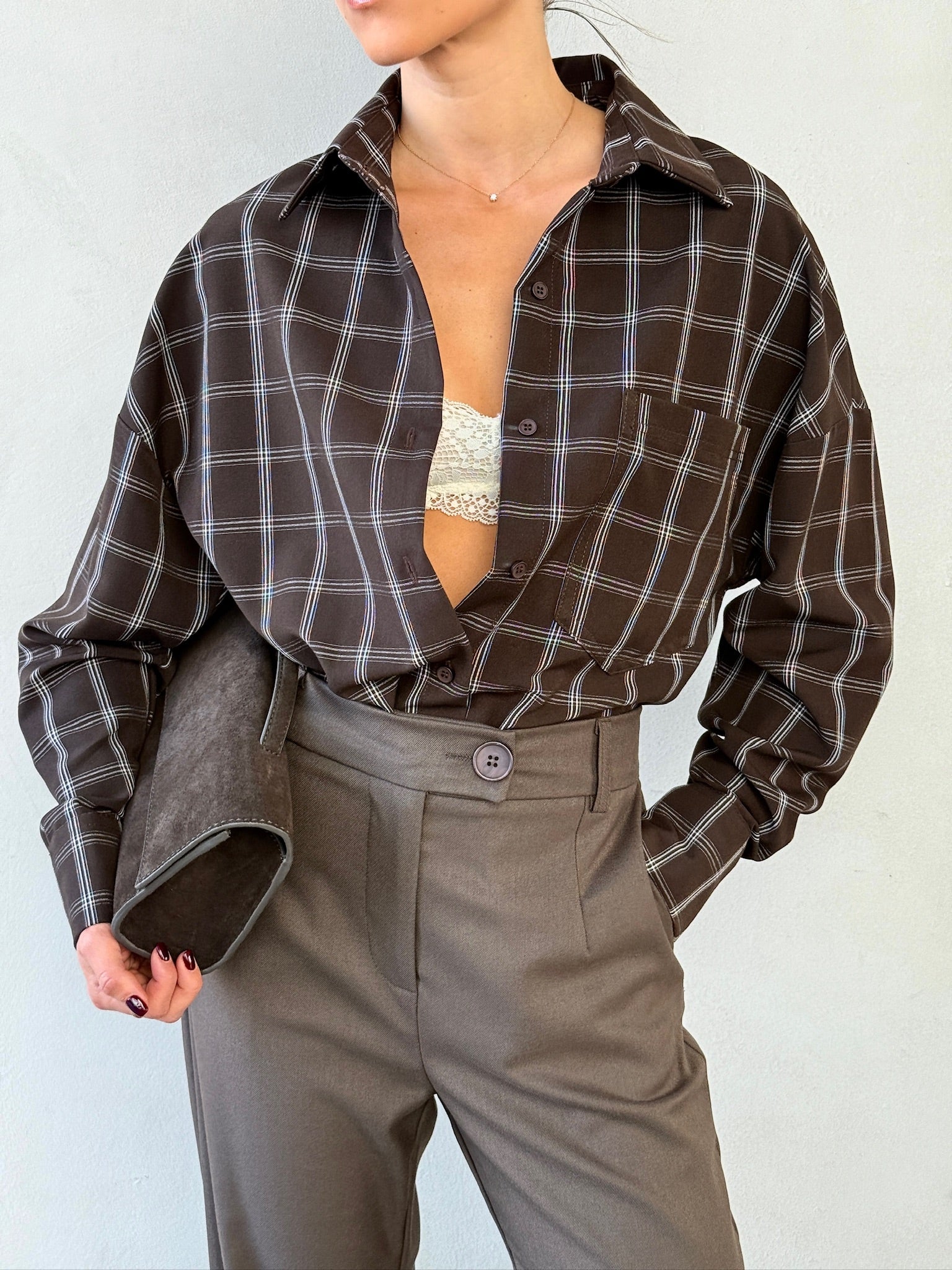חולצת המשבצות המכופתרת שלנו בגרסת ה-Oversize מעניקה מראה נינוח אך מוקפד, עם בד נשפך ונעים שמרגיש כמו ענן על הגוף.