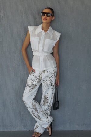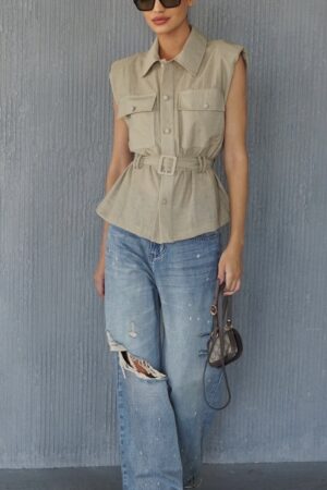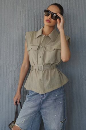 מכופרת ללא שרוולים עם צווארון מבד פשתן שקפקף קייצי רכיסת כפתורים, כיסים וחגור במותן.