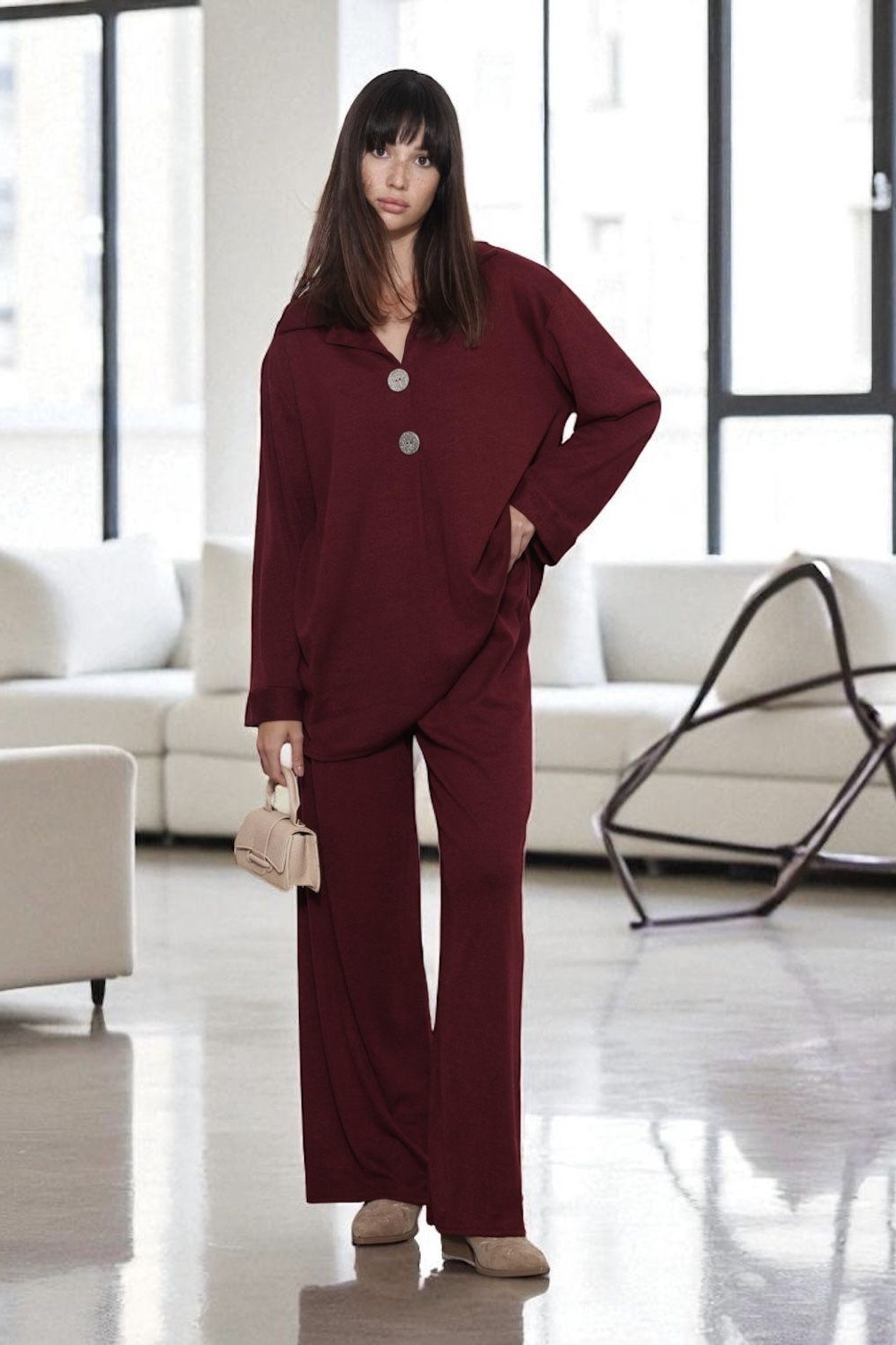 חולצה לוזית עם כפתורים ומפתח וי עם צווארון, מכנס עם כיסים סיומת פדלפון.