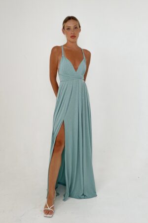 לשמלה כתפיות קשירה, גב חשוף ושסע מקדימה.