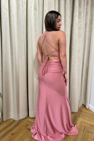 שמלת ערב בגזרת מקסי מבד סאטן משי, לשמלה כתפיות דקות היוצרות איקסים בגב. לשמלה שסע מקדימה.