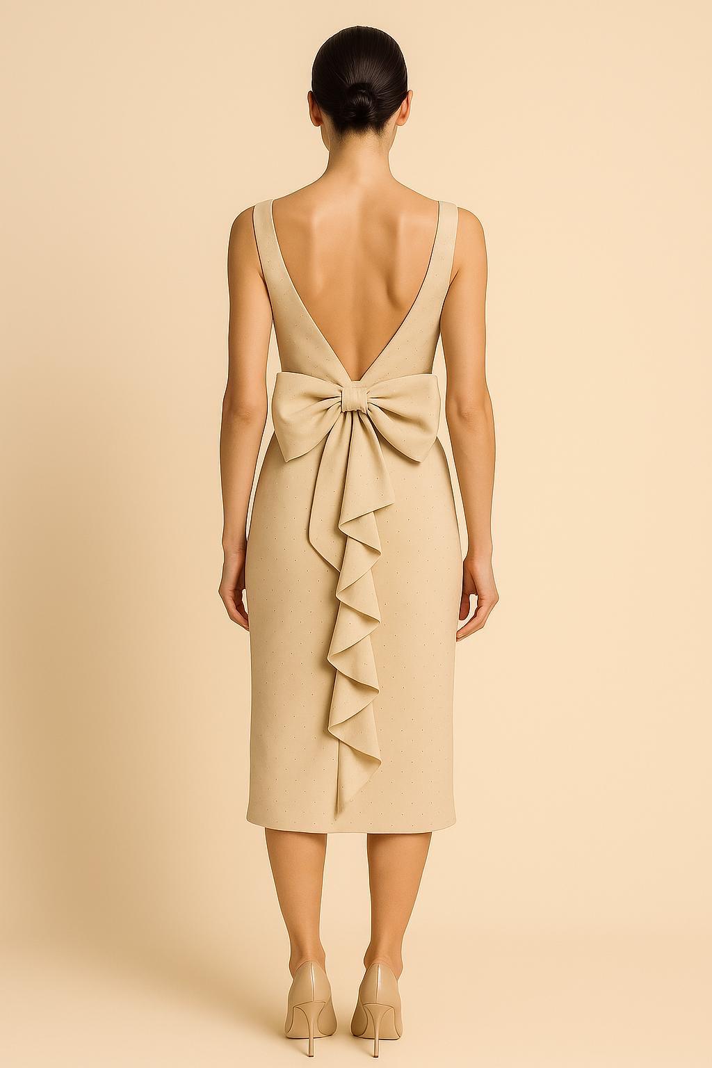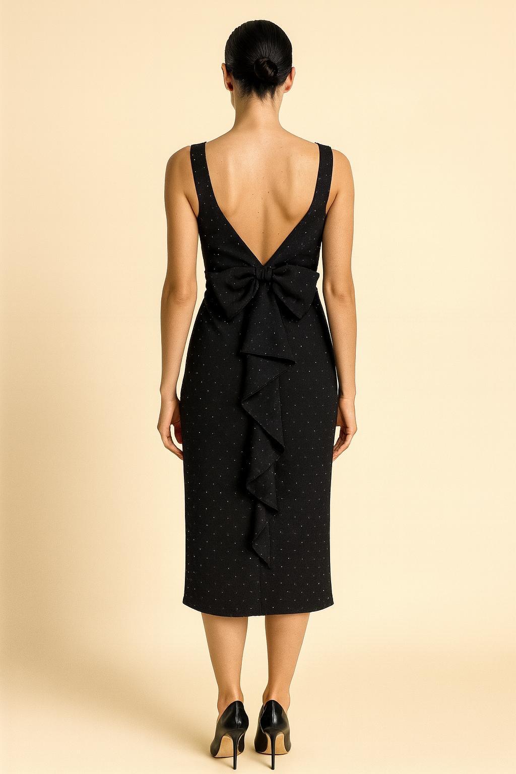 שמלת ערב מבד לייקרה מחטב משובץ אבנים קטנות כסופות, מפתח וי מיוחד, בגב השמלה יש פפיונים. ONE SIZE.