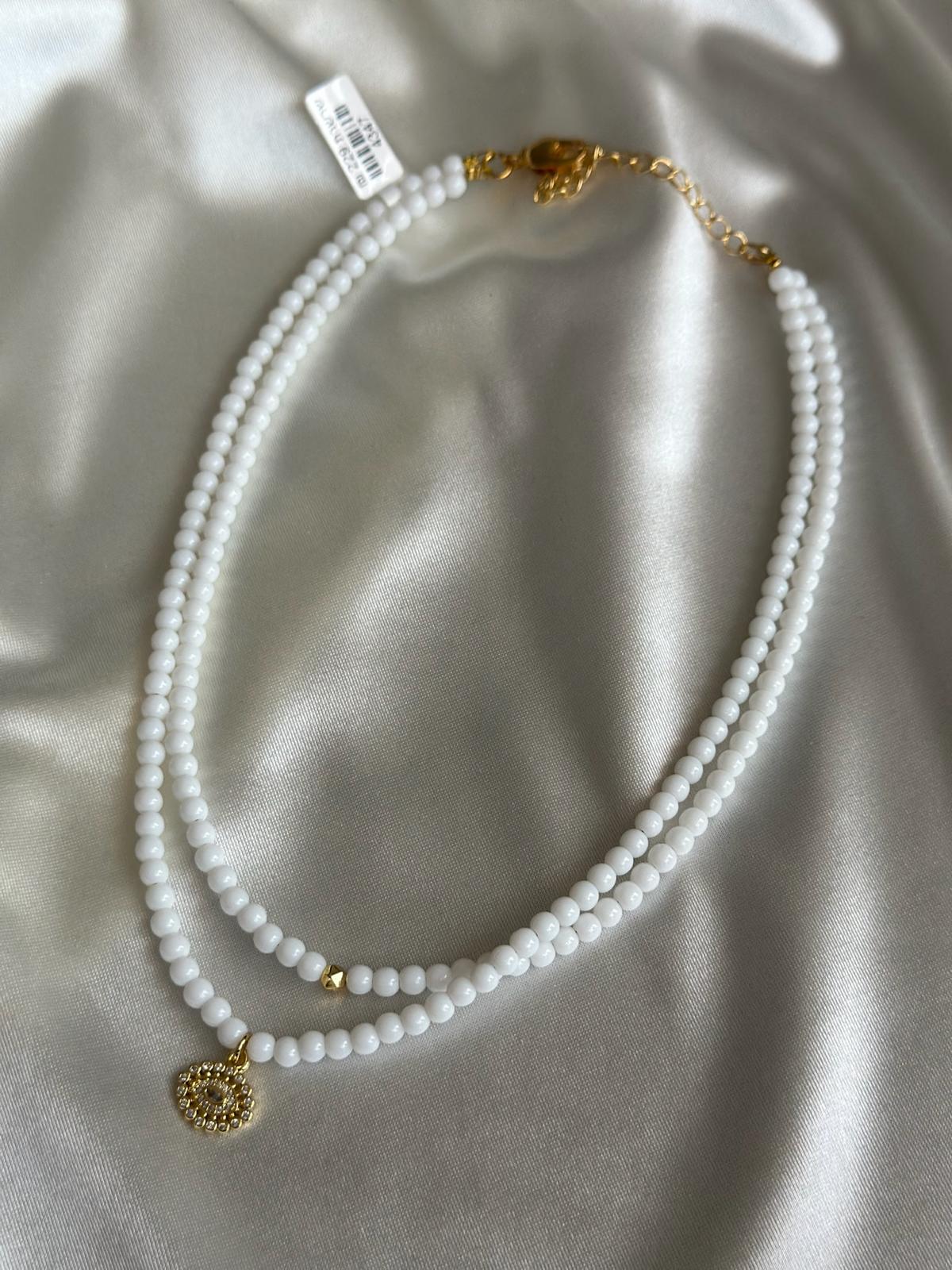 2 שרשראות חרוזים לבנים מחוברות לשרשרת אחת, משולבות תליון מוזהב
