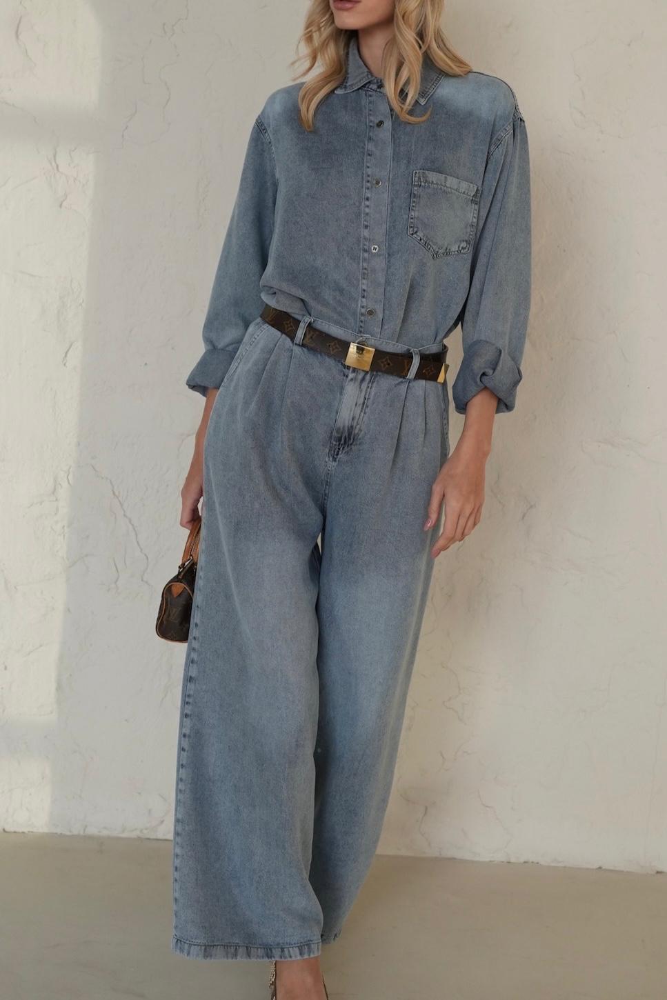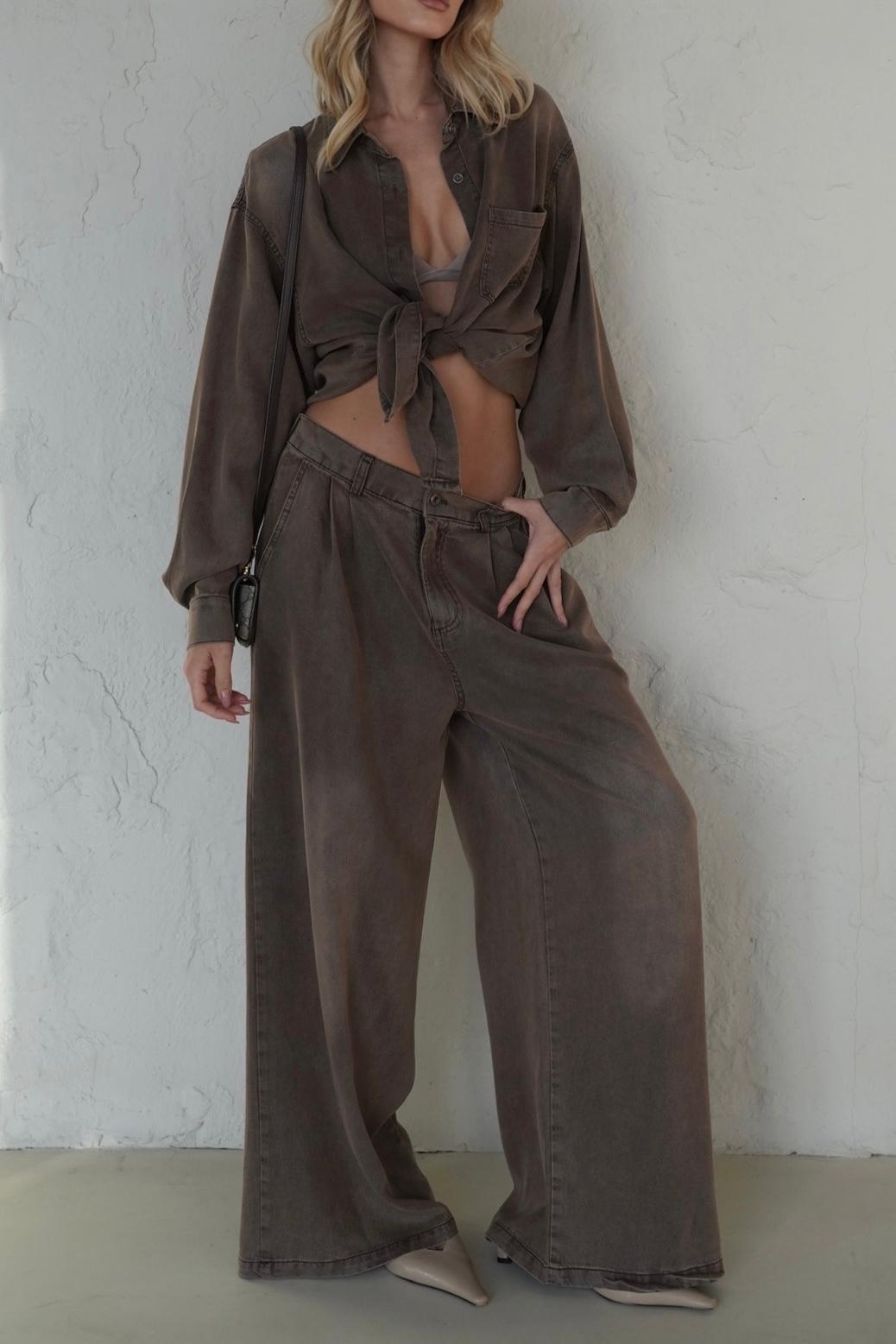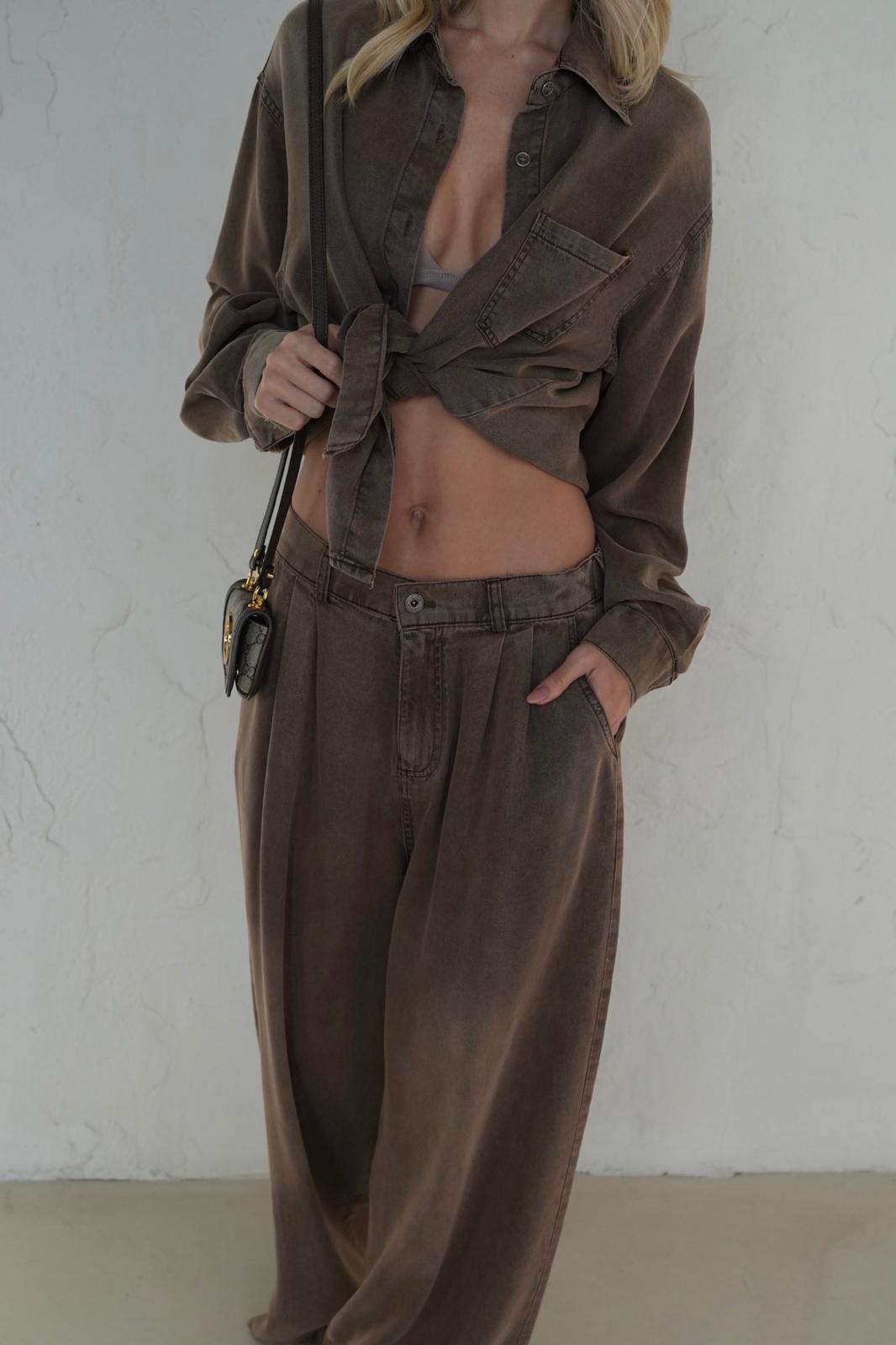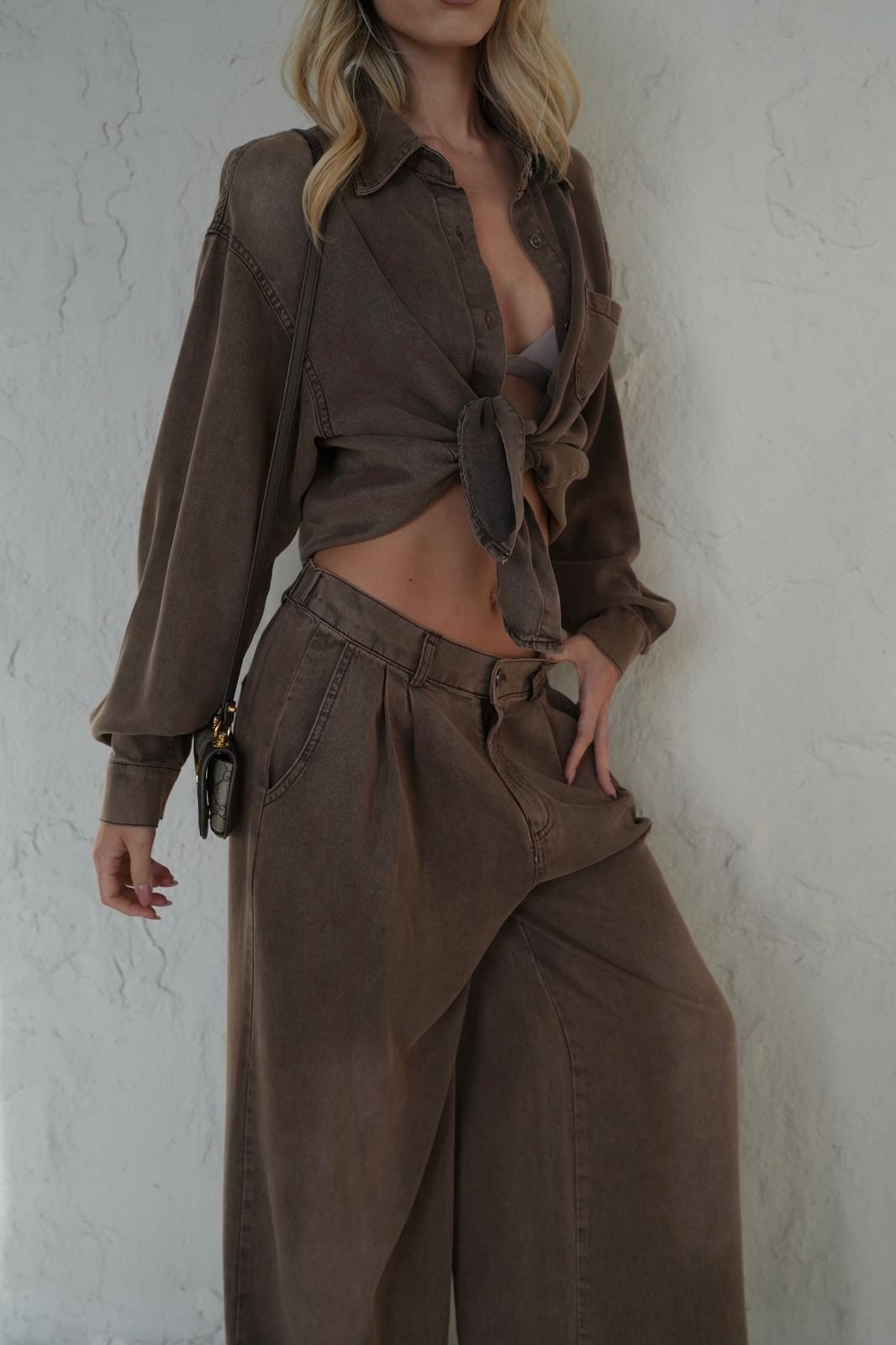 הסט מורכב מחולצה מכופתרת קלאסית ומכנסיים תואמים בגזרה רחבה, שניהם עשויים מבד רך ואיכותי שעבר שטיפה מיוחדת (Wash) המעניקה לו גוון עמוק, עשיר וייחודי.