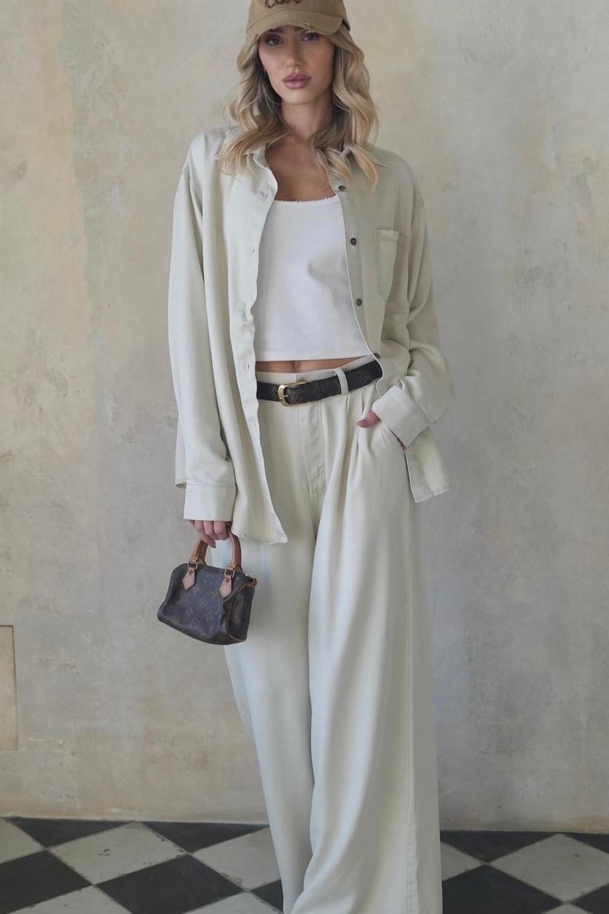 המכנסיים: גזרה גבוהה ומחמיאה, רגליים רחבות (Wide-Leg) ותיפורי כיווצים במותן המעניקים נפח נכון ותנועה חופשית.