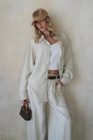 החולצה: גזרת אוברסייז משוחררת עם צווארון קלאסי וכיסי חזה בולטים המעניקים טאץ' צבאי-אורבני. ניתנת לקשירה במותן (כמו בתמונה) למראה נועז יותר.