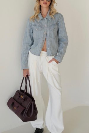 החולצה עשויה מבד ג'ינס דק ונושם בגוון תכלת רענן, עם דוגמת פסים אנכיים עדינה המעניקה לה מראה מוארך ומחמיא.