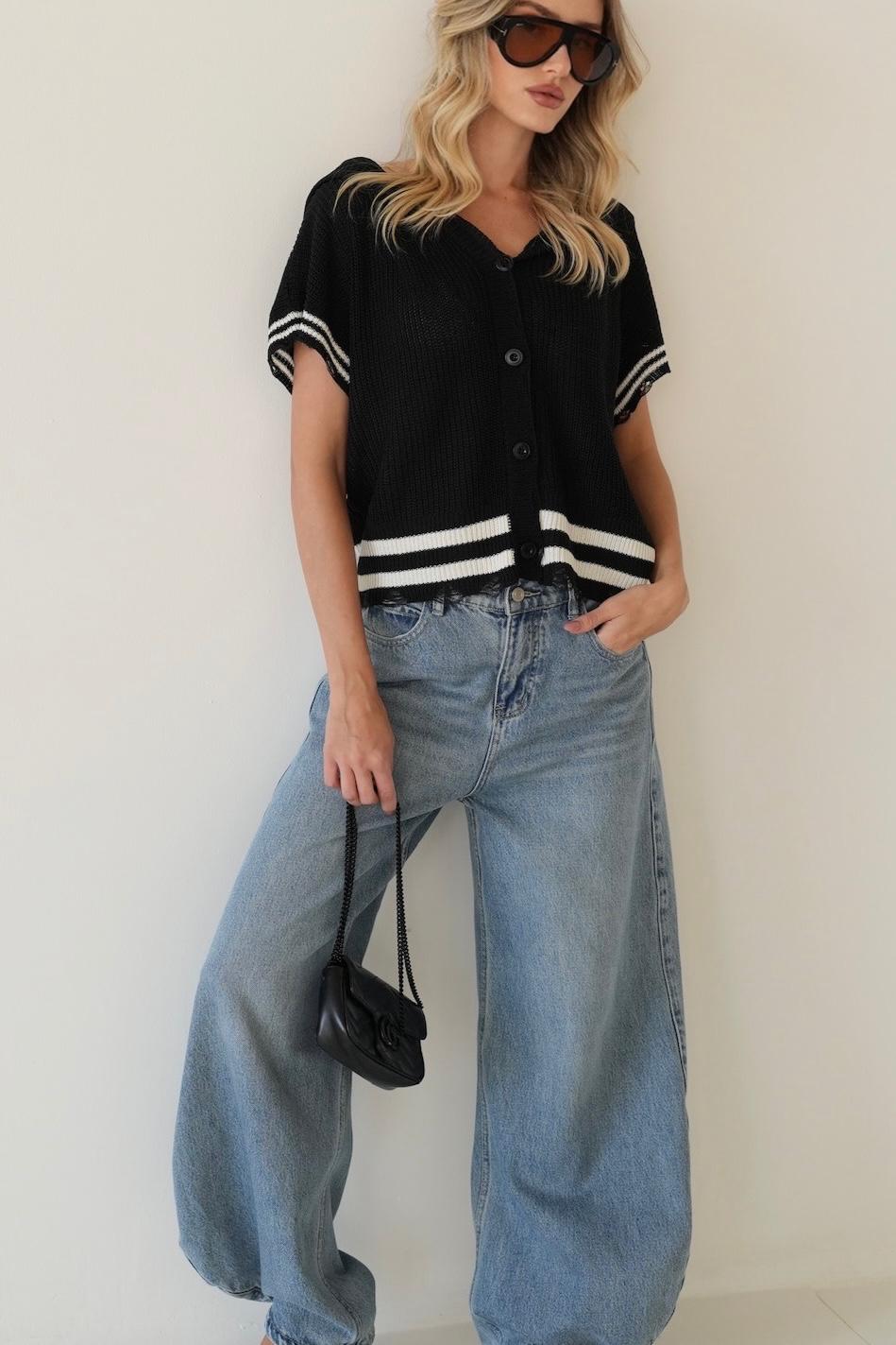 סריג קליל עם שרוול קצר, המשלב קפוצ'ון (Hoodie) וסגירת כפתורים קדמית למראה שכבות ורסטילי