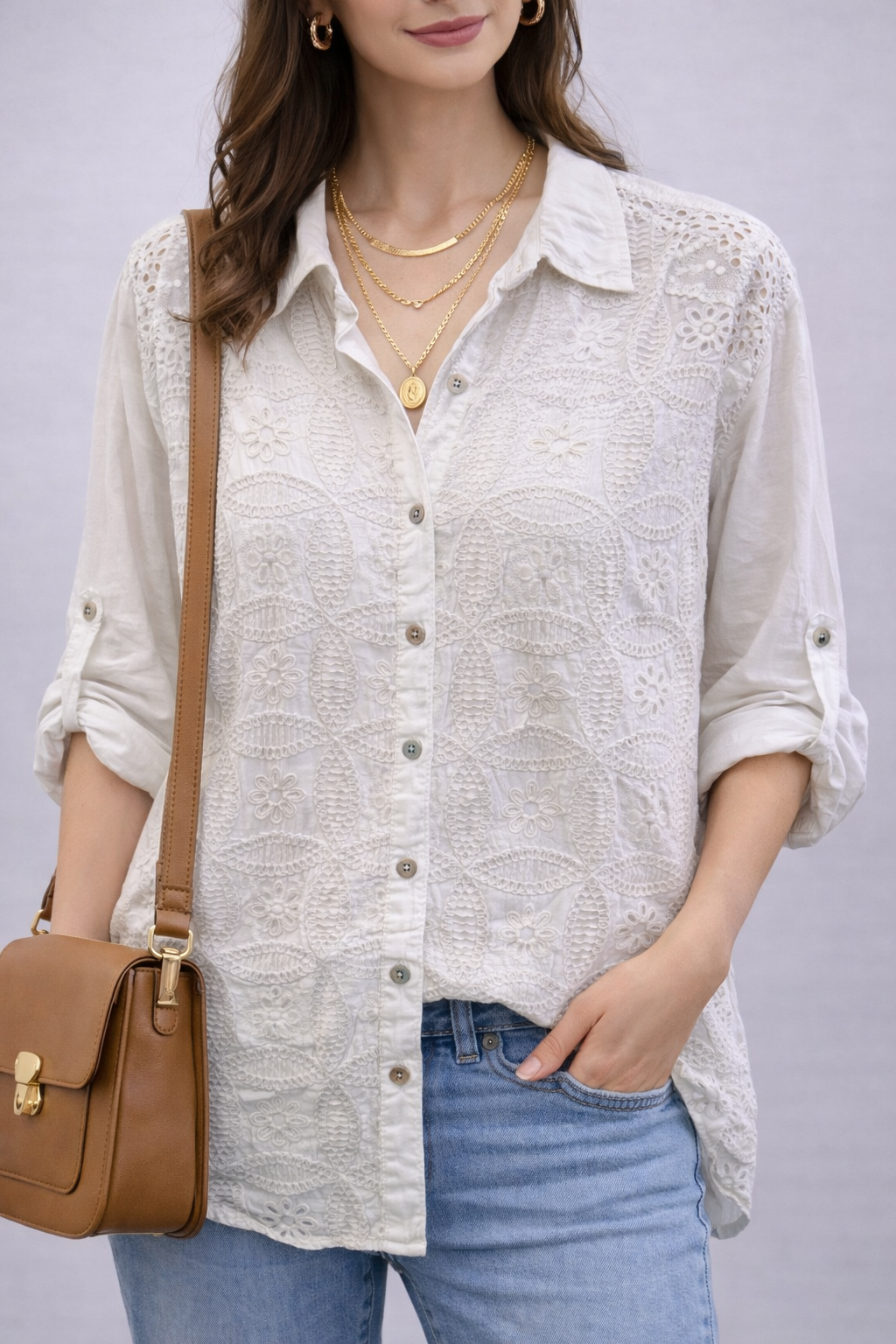 • עיטורי רקמה מרהיבים: חזית החולצה מעוטרת ברקמת תחרה (Eyelet) עדינה בדוגמאות פרחוניות וגיאומטריות, המעניקות לה מראה יוקרתי ועבודת יד.
