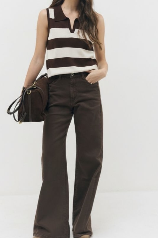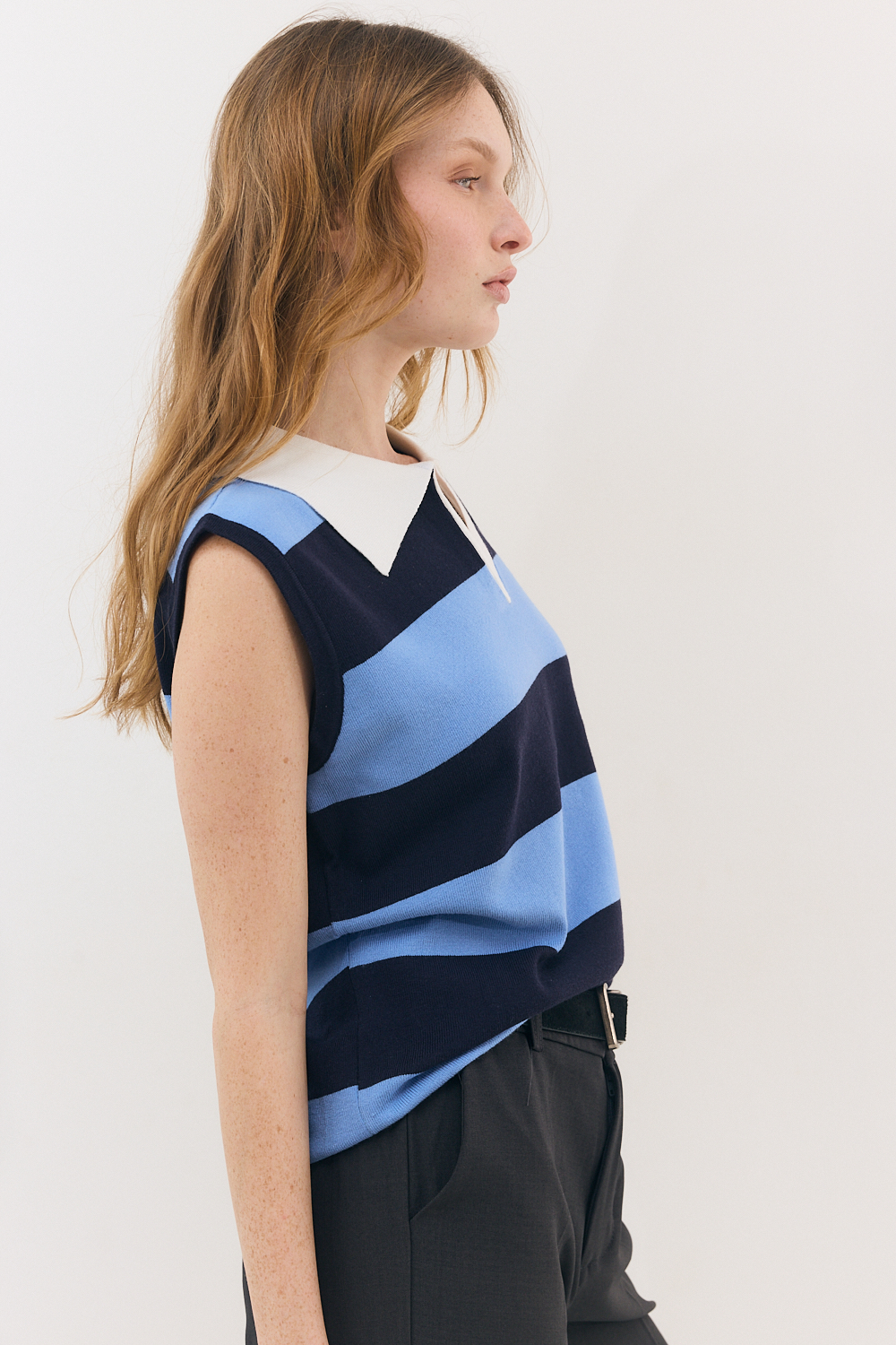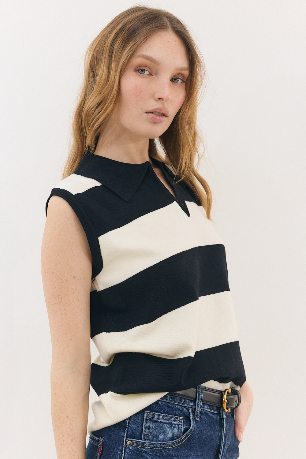 גופיה קלאסית ושיא הסטייל בשילוב צווארון פולו אלגנטי עם פסים רחבים לכל האורך.