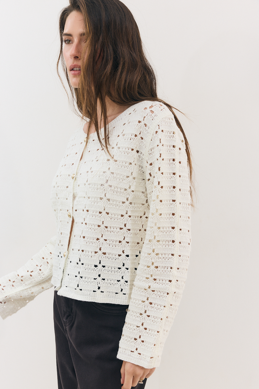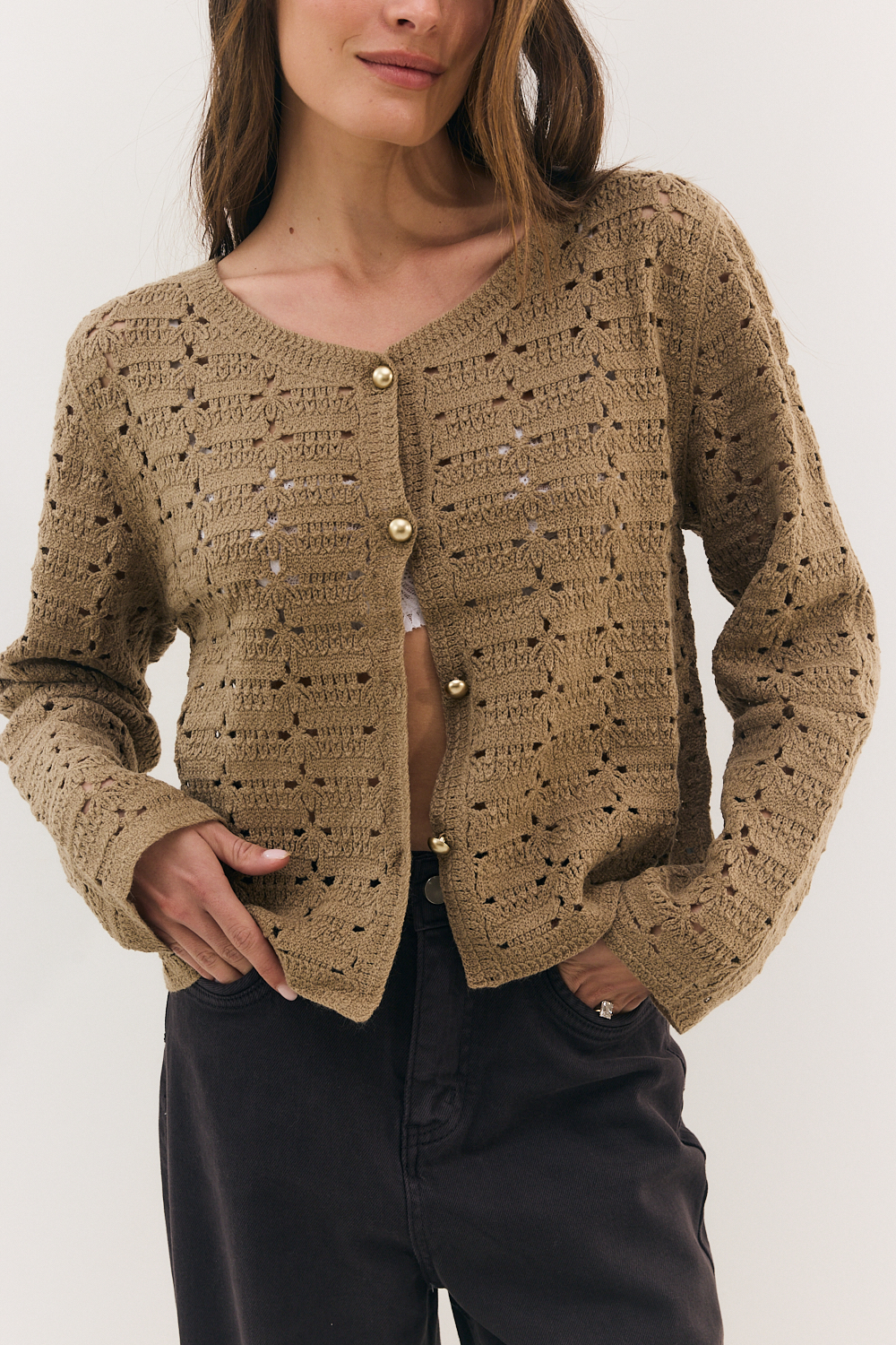 קרדיגן קרושה עדין ומלא בסטייל, משולב בכפתורי זהב למראה יוקרתי ואלגנטי.