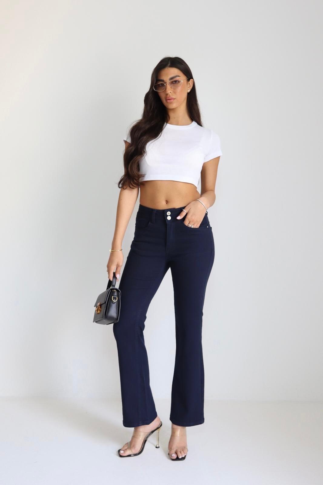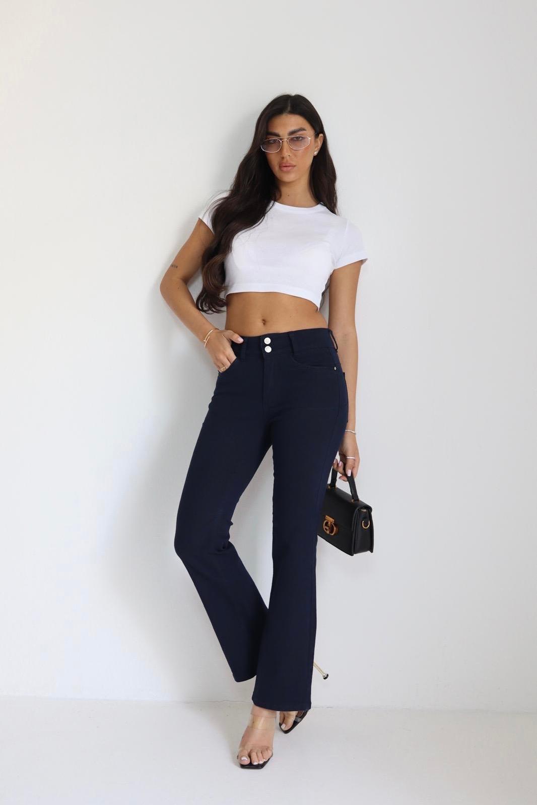 המכנסיים נצמדים באזור הירכיים ונפתחים בעדינות מהברך ומטה, עיצוב שמאריך ויזואלית את הרגל.