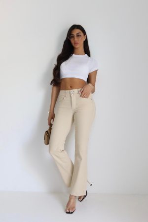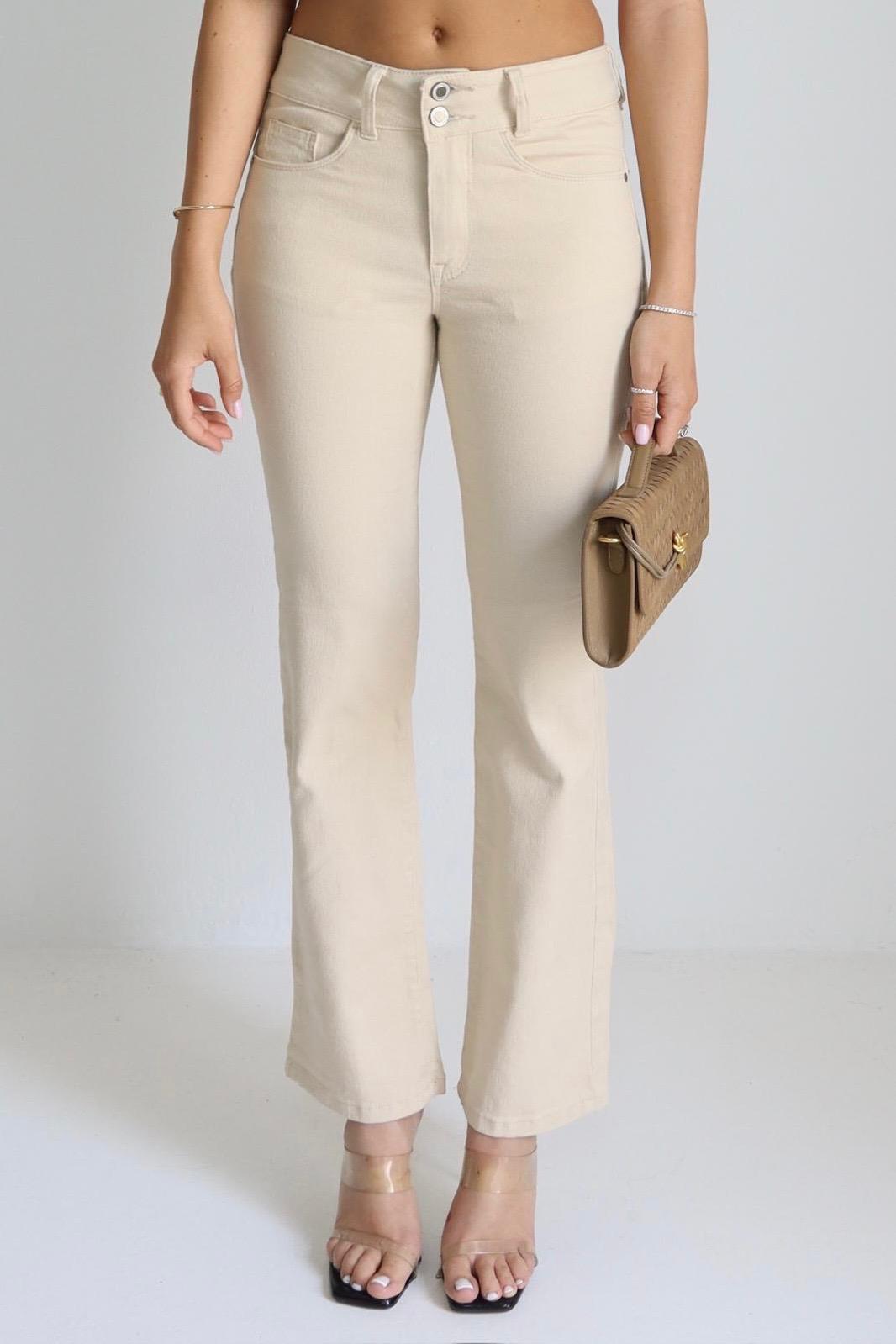 המכנסיים נצמדים באזור הירכיים ונפתחים בעדינות מהברך ומטה, עיצוב שמאריך ויזואלית את הרגל.