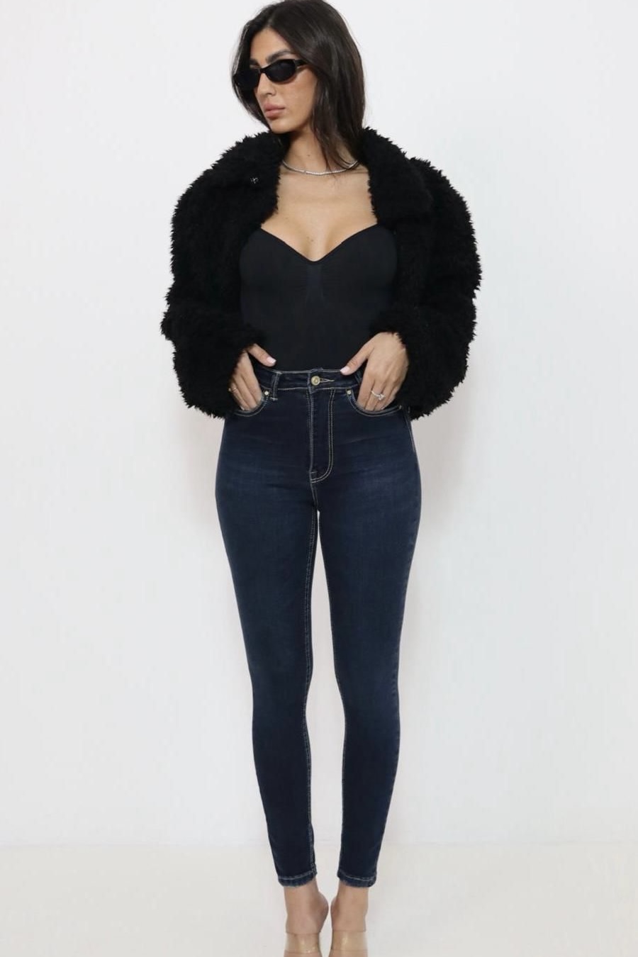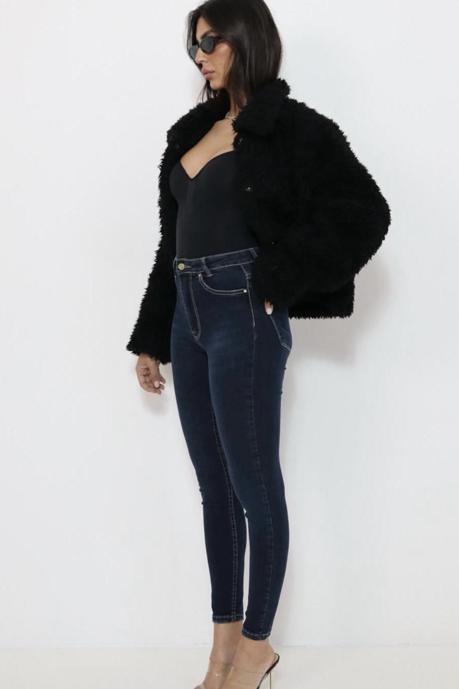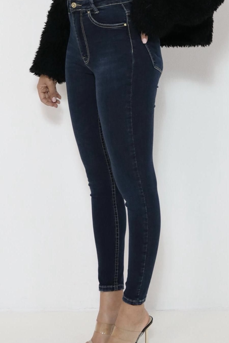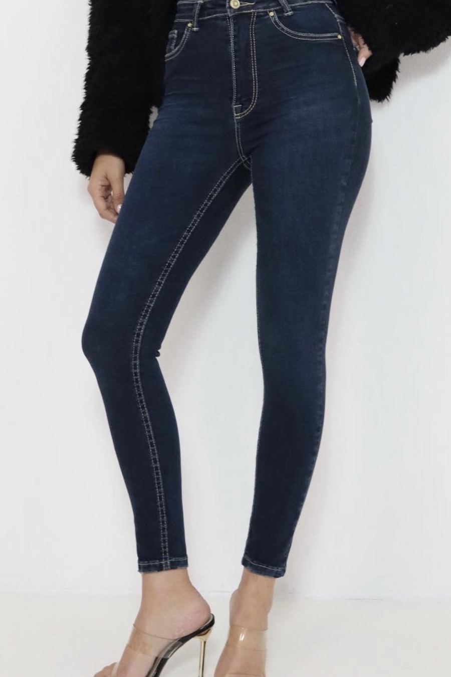 גינס סקיני בגזרה ישרה וגבוהה שמחמיאה לגוף.