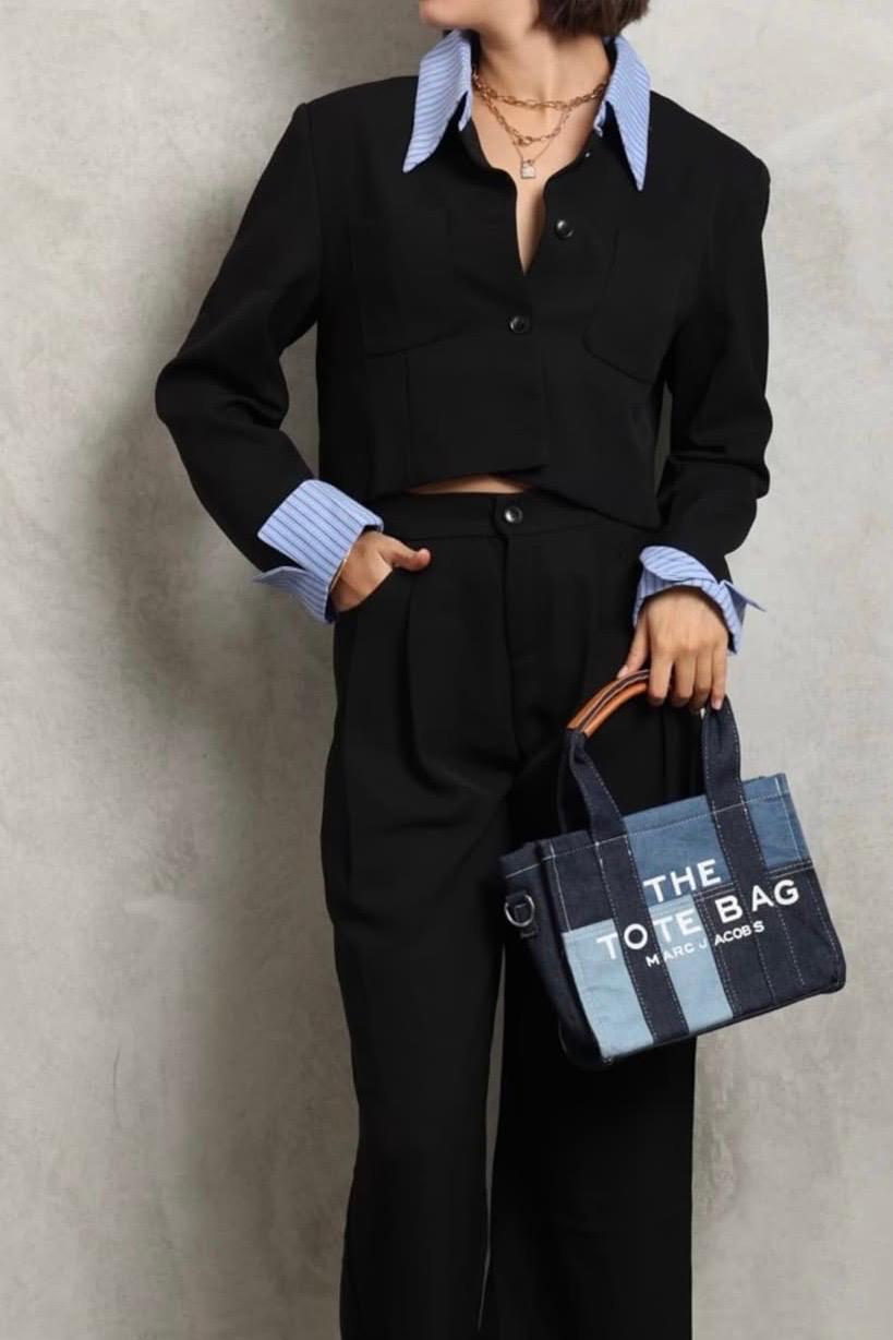 גקט בגזרת קרופ קצר עם משבצות בצווארון ובסיומת השרוולים כיסים סגירת כפתורים