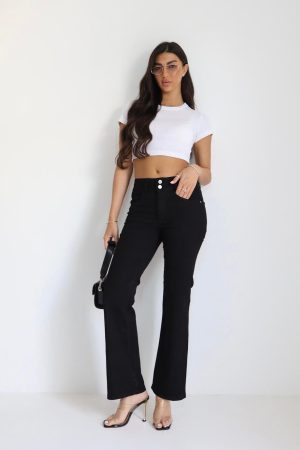 המכנסיים נצמדים באזור הירכיים ונפתחים בעדינות מהברך ומטה, עיצוב שמאריך ויזואלית את הרגל.